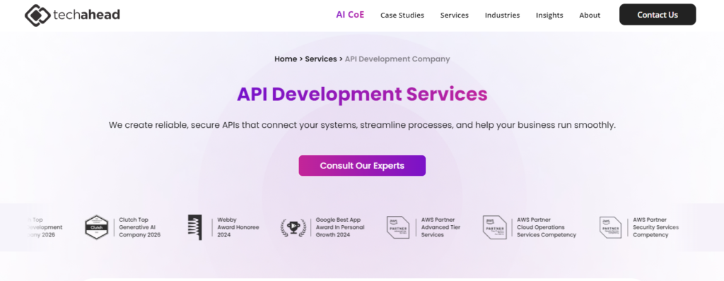 TechAhead is a technology consulting company offering API development services for mobile-first and cloud-based applications. The company focuses on building lightweight, high-performance APIs that support modern user experiences. TechAhead works closely with product teams to ensure backend systems align with frontend requirements and rapid release cycles. Its agile development approach helps businesses reduce time-to-market while maintaining API reliability and scalability.